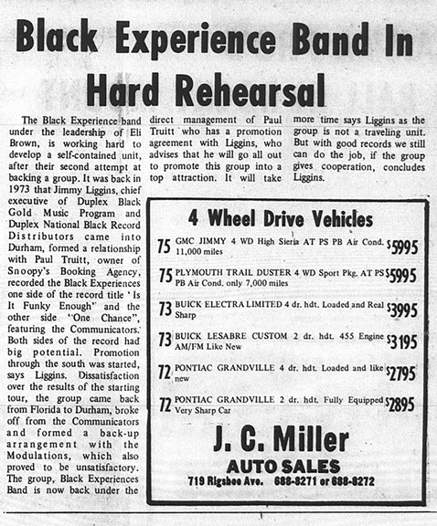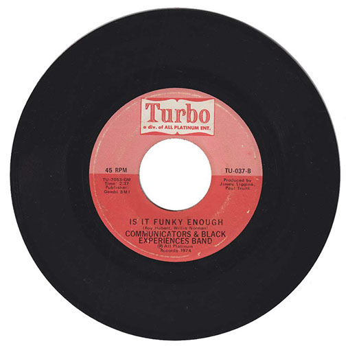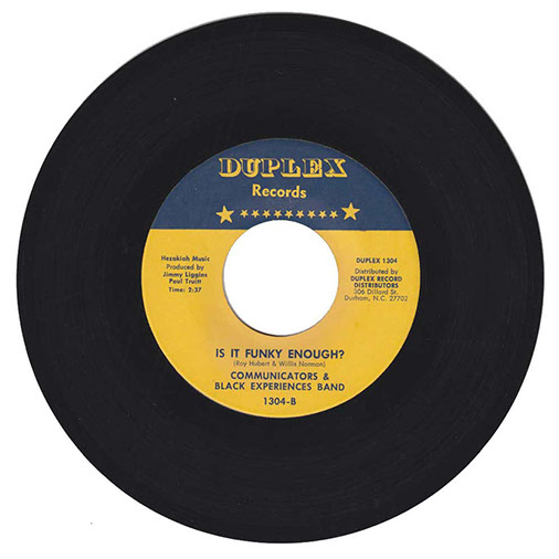 The band’s early line-up featured Charles Bailey (trumpet), James “Butch” Barton (trombone), Eli Brown (saxophone), Willis Norman (lead guitar), Roy Hubert (rhythm guitar), Willie Hill (bass guitar), and Linwood Parker (drums). The B-sides of their two records with the Communicators highlight the band’s immersion in funk in the style of Kool & the Gang and Funkadelic. After parting ways with the Communicators, the group backed up the Modulations for a time and then played as a self-contained band before breaking up. Later line-ups included James Brown, a saxophonist who also played with Bite, Chew & Spit out of Asheville, and trombone player Bill Amey.
