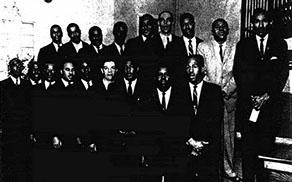 Gospel music thrived at local African American churches like St. Joseph’s A.M.E., Mount Vernon Baptist, Mt. Zion Baptist, West Durham Baptist, White Rock Baptist, St. Paul Baptist, and the Russell Memorial C.M.E. Church. Gospel’s spirited call-and-response, multi-part harmony vocals, and syncopated rhythms gave many musicians a blueprint for secular soul music. Some performers, such as Oren Marsh (pictured below, back row, third from right), sang with gospel choirs and also performed with soul acts outside of the church like Tracy and the Jammers.