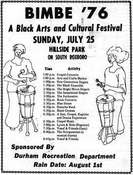 In 1969, African American students from Duke University and North Carolina College for Negroes (now NCCU) organized a black arts and music festival for the first time in Durham. Named in honor of the Afro-Caribbean celebration Bembe, the festival is still held annually and has become a Durham institution. Over the years, Bimbe featured many soul artists, including Blue Steam and Duracha in 1976, as shown in this newspaper advertisement.