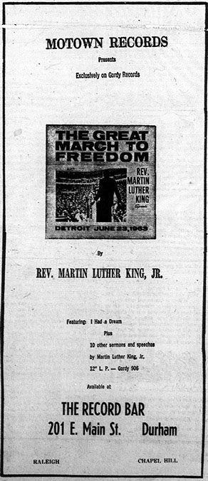 Gordy Records, an imprint of Motown, released this recording of a 1963 speech given by Dr. Martin Luther King in Detroit. Record Bar’s advertisement for the record appeared in The Carolina Times in May 1968, a month after King’s assassination.