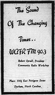 WAFR was a black non-commercial radio station from 1971 to 1976. Unlike commercial broadcasters, WAFR didn't have to worry about keeping advertisers happy. As a result, the station was able to produce highly political programming. At the height of the Black Power movement, the station was a radical voice for independent black politics and culture. WAFR deejays took on Arabic and African names on the air, and the station’s call letters referenced Africa. WAFR’s early staffers included Obataiye Akinwole, Donald Baker, Ralph Williams, Robert Spruill, and Jim Davis.